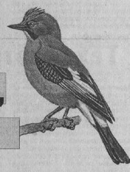 «Сойка - Garrulus glandarius. Величиной с голубя. Спина рыжевато-серая, крылья и хвост черные. На сгибе крыла яркие голубые с черными полосками перья. На голове хохол, который у европейской формы рыжеватый, у кавказской и крымской - чёрный, а у сибирской - ярко-рыжий.